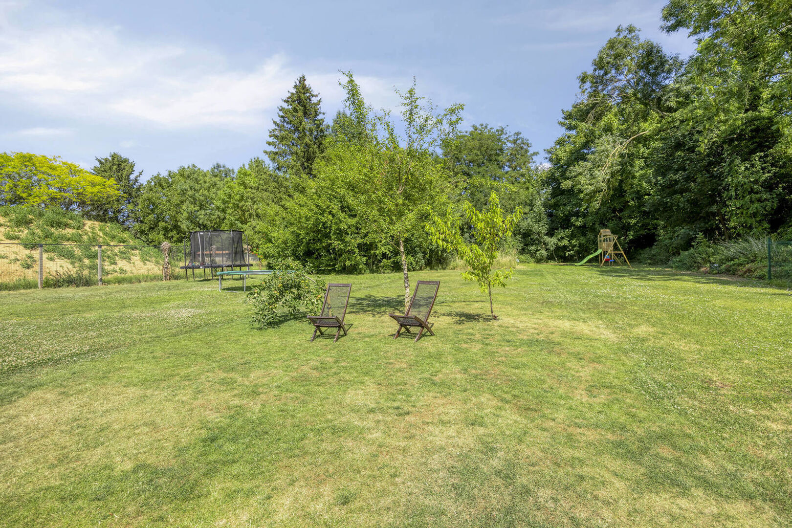 The entrance hall (15 m²) with guest toilet and cloakroom leads into the bright living area with an open kitchen. This spacious 44.7 m² living room, equipped with underfloor heating, opens onto a large, low-maintenance terrace (46.1 m²), partly tiled and partly finished with white gravel. It overlooks a wooded area at the rear, ensuring maximum peace and privacy – with no overlooking or fencing.