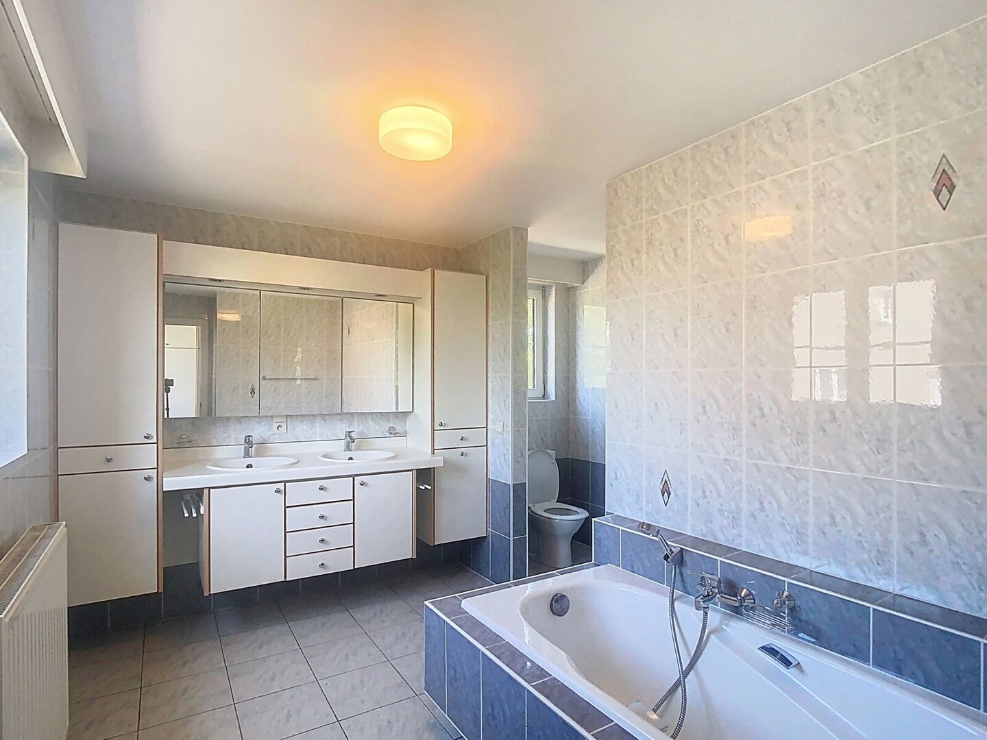 Entrance hall with toilet and vestiaire - living room 46,3m² (tiled floor) with fireplace - dining room 13,7m² (tiled floor) - fully equipped kitchen with breakfast corner 20m² (tiled floor): fridge, dishwasher, microwave, oven, ceramic stove - study 20m² - 5 bedrooms (laminate, 2x with built-in closets): 2x 16m² / 10,4m² / 20,5m² / 9m² - dressing 5m² - bathroom with bath, shower cabin and vanity with 1 sink - bathroom with bath, shower cabin, toilet and vanity with 2 sinks (ensuite bedroom 4) - shower room with shower cabin and vanity with 1 sink - store room 6,76m² - laundry room 5m² (in the garage) - garage for 2 cars, with remote control - attic - cellar: provision cellar 63m² / laundry room 12m² - garden (fenced, or south) with terrasse 49m² and 17m².