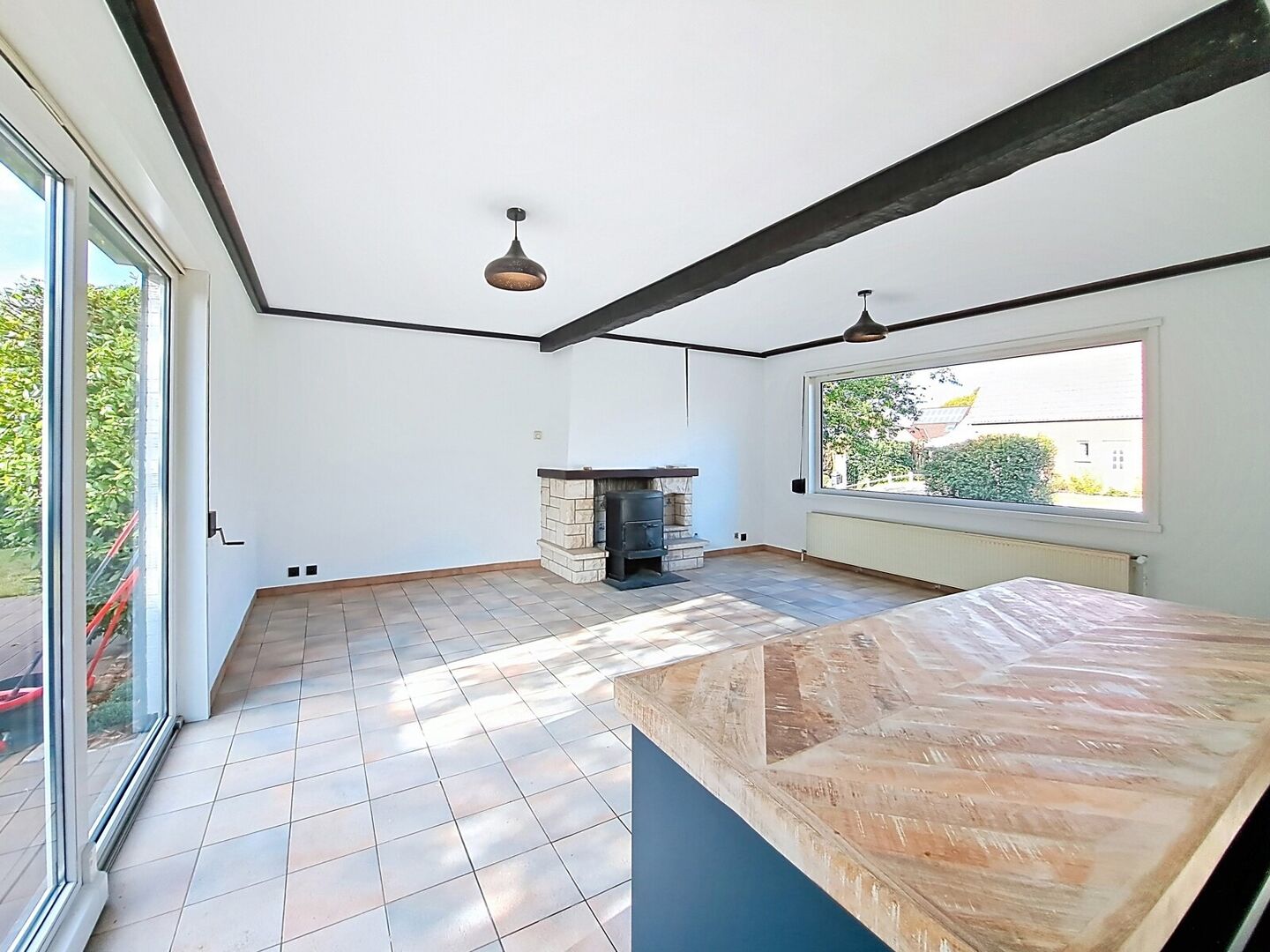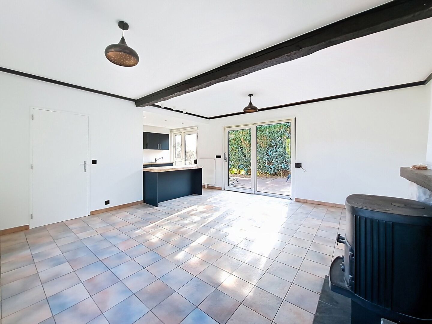 En entrant, vous découvrez un hall d’entrée soigné avec sol carrelé et toilette séparée. De là, vous accédez à un séjour lumineux de ±27 m², en connexion harmonieuse avec la cuisine ouverte et contemporaine.