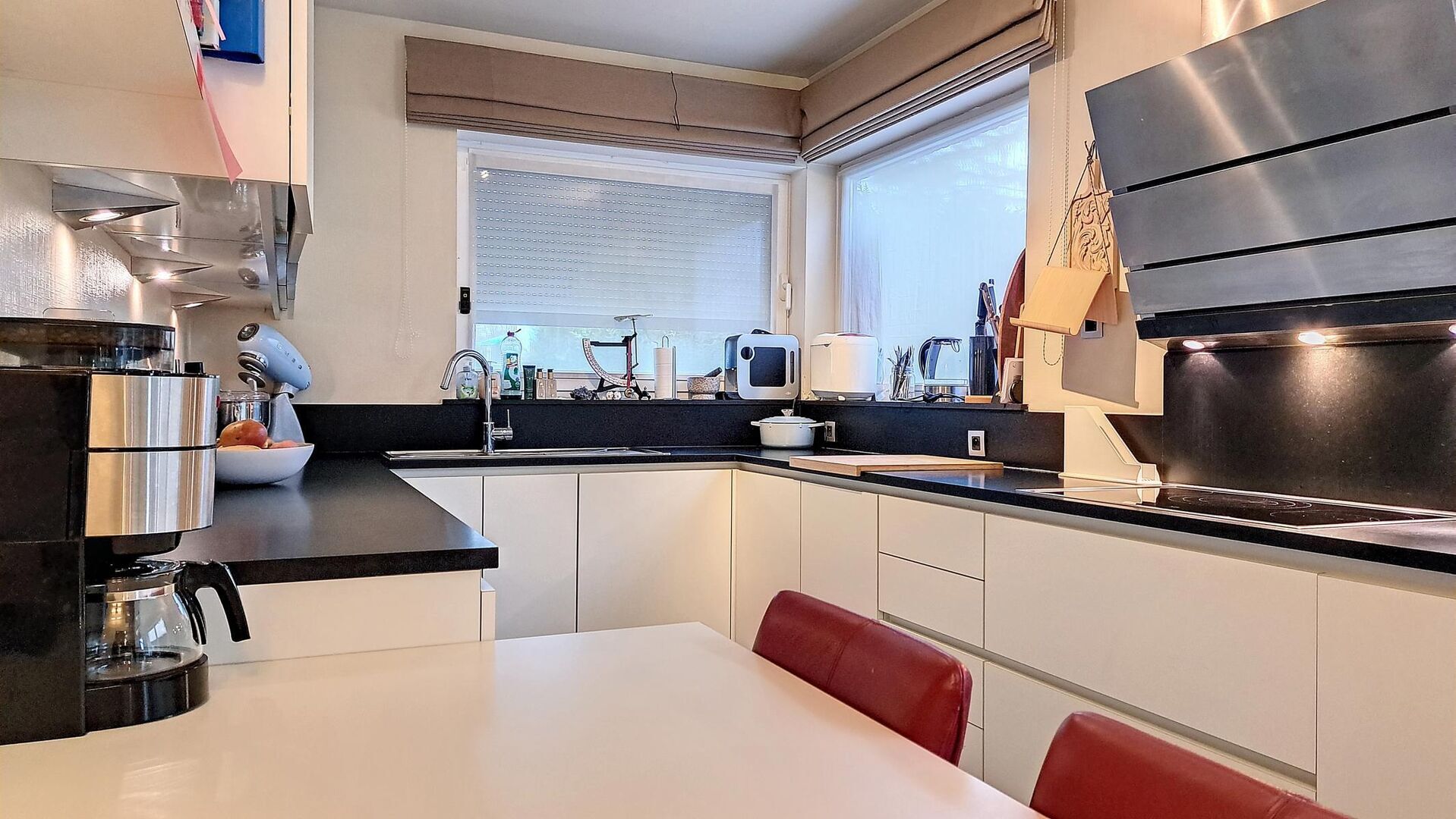 Hall d'entrée avec toilette et vestiaire (carrelages) - living 19,6m² (carrelages) - salle à manger 16,4m² (carrelages) - cuisinie équipée avec coin repas 16,4m² (carrelages): frigo, lave-vaiselle, micro-onde, four, cuiisnière céramique - bureau 8,2m² (laminaat) - jardin avec cabanne et terrasse 17,5 (or est).