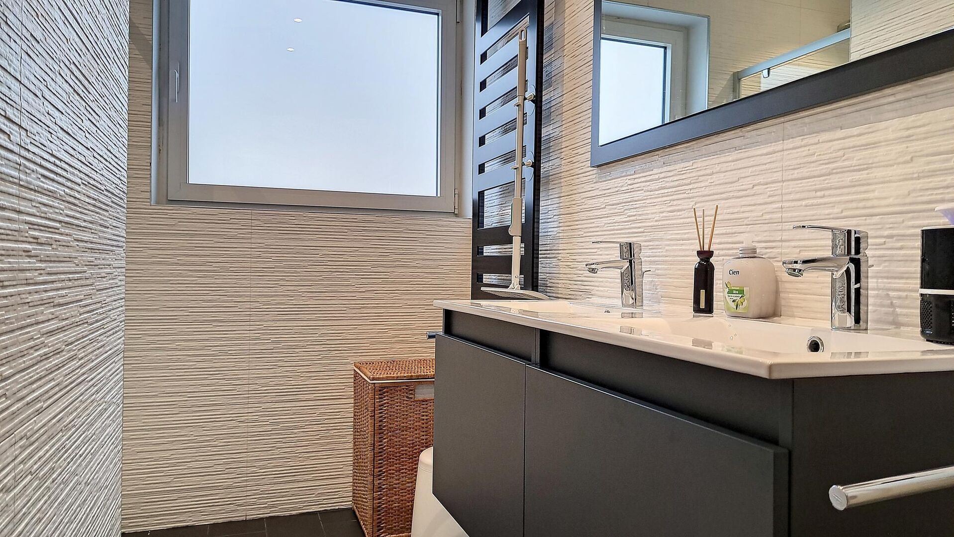4 chambres à coucher (laminat): 2x 11,3m² / 16,3m² avec armoires incorporées / 10,1m² - salle de bains avec baignoire/douche et 2 lavabo en meuble - salle de douche avec cabine de douche et 2 lavabo en meuble.