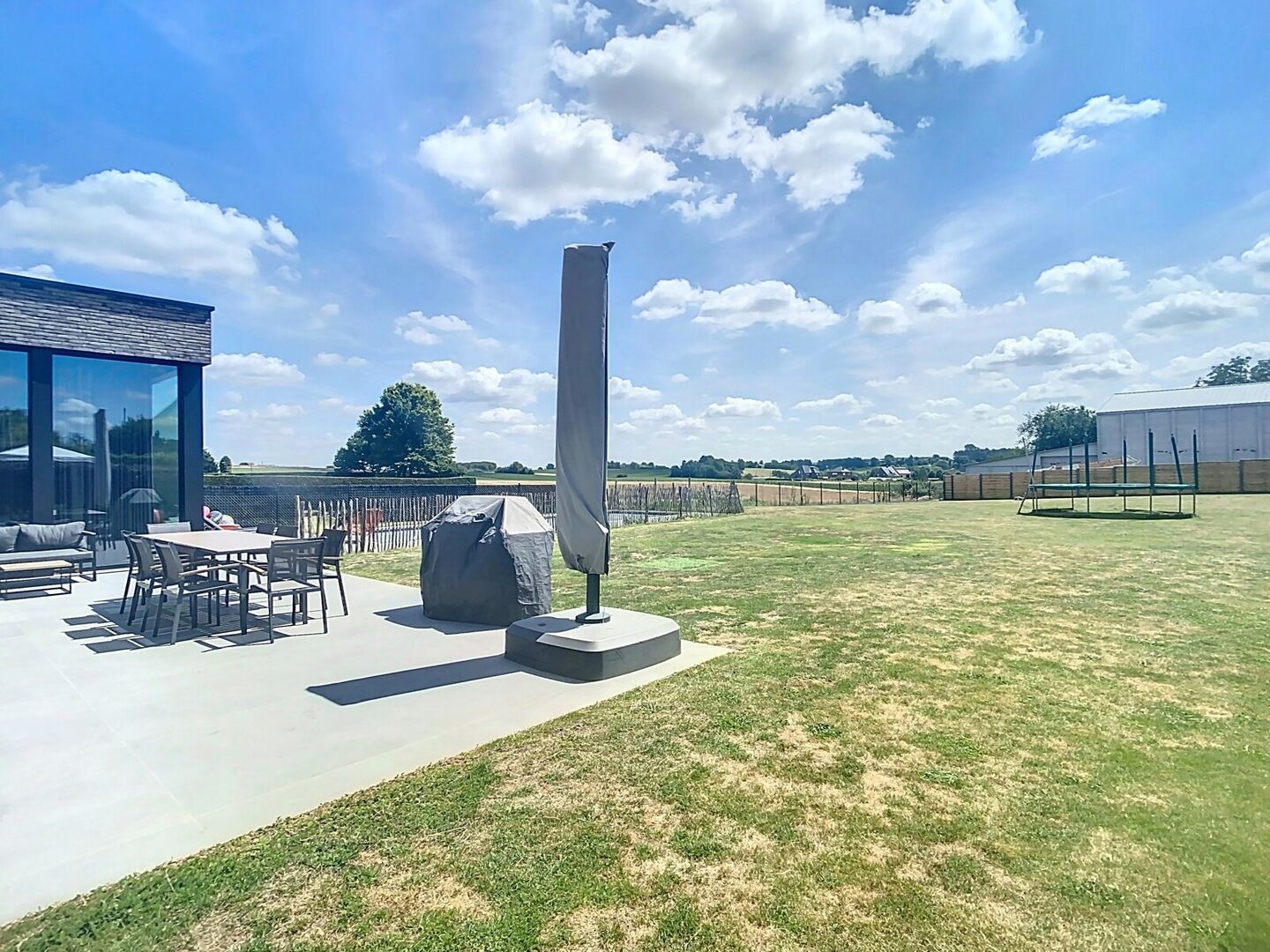 Le jardin entièrement aménagé est orienté plein sud et dispose d’une magnifique piscine avec vue sur les champs environnants – idéal pour les amateurs de calme et d’espace.