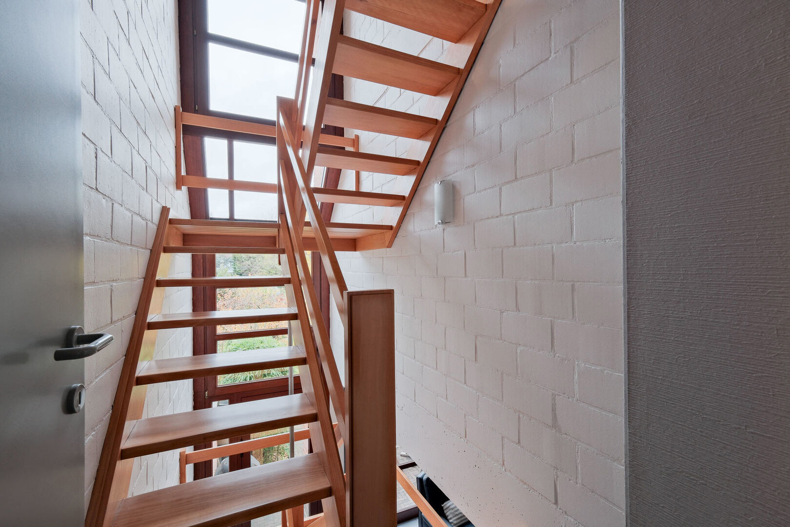 De benedenverdieping omvat een lichte en aangename leefruimte van 23,2 m² met houtkachel en grote architecturale raampartijen. Vanuit deze woonkamer heeft u directe toegang tot het zonnig terras van 26,4 m² en de fraai aangelegde, omheinde tuin.