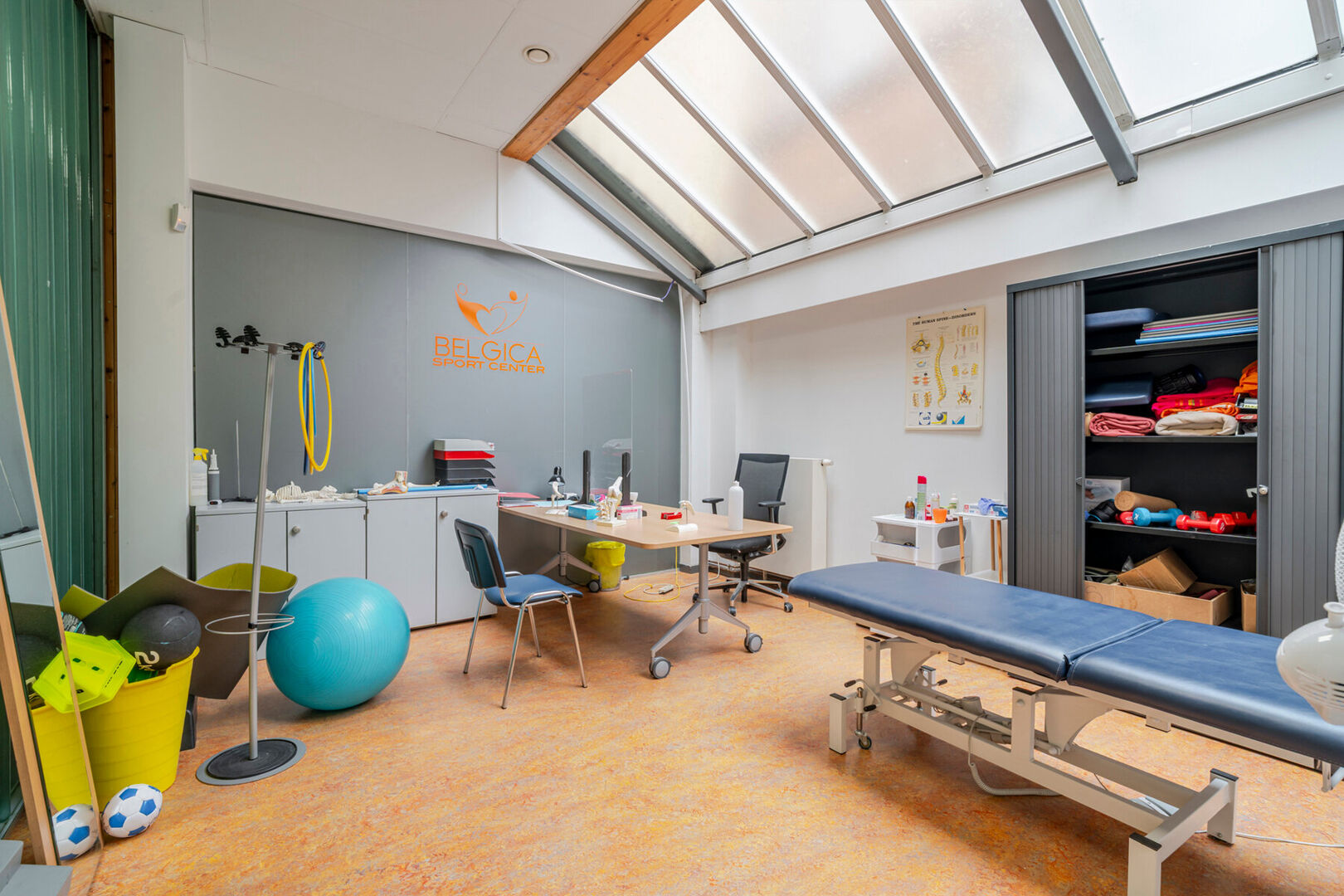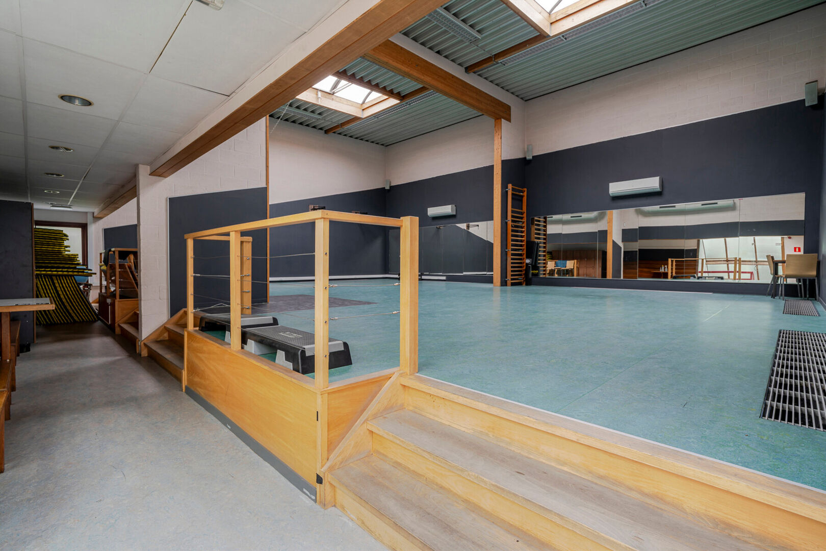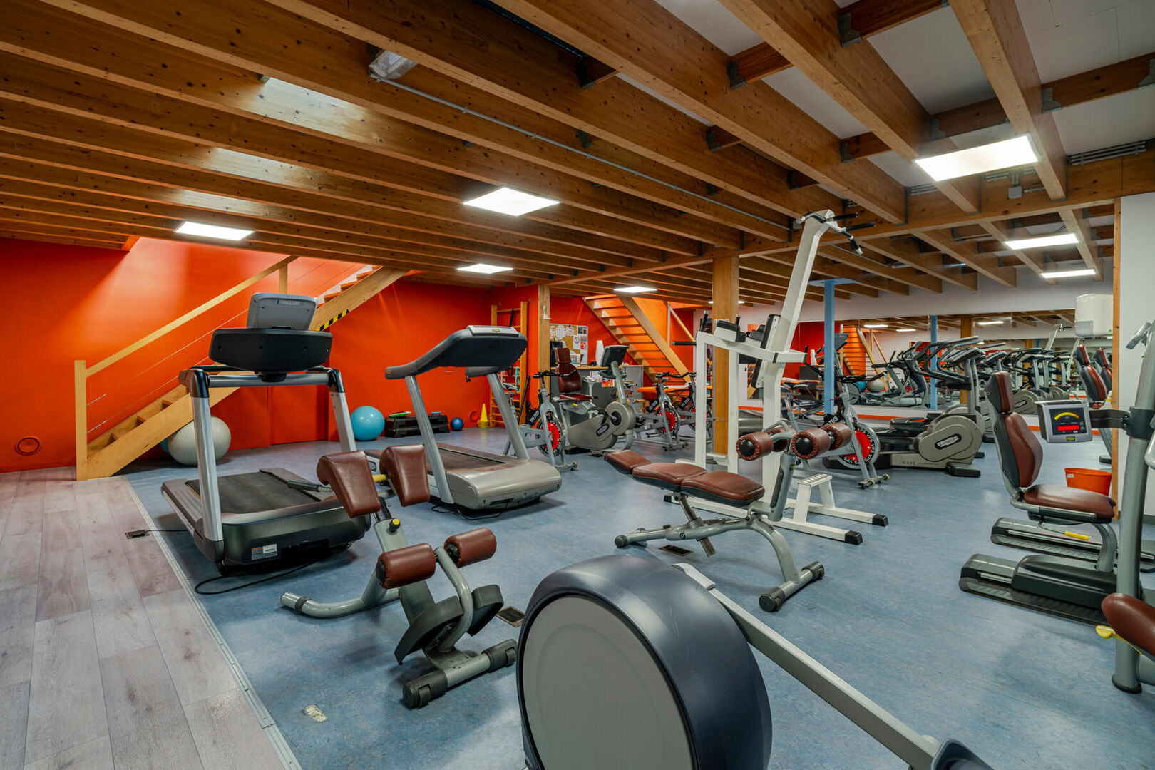 - 2 fitnesszalen verdeeld over gelijkvloers en eerste verdieping