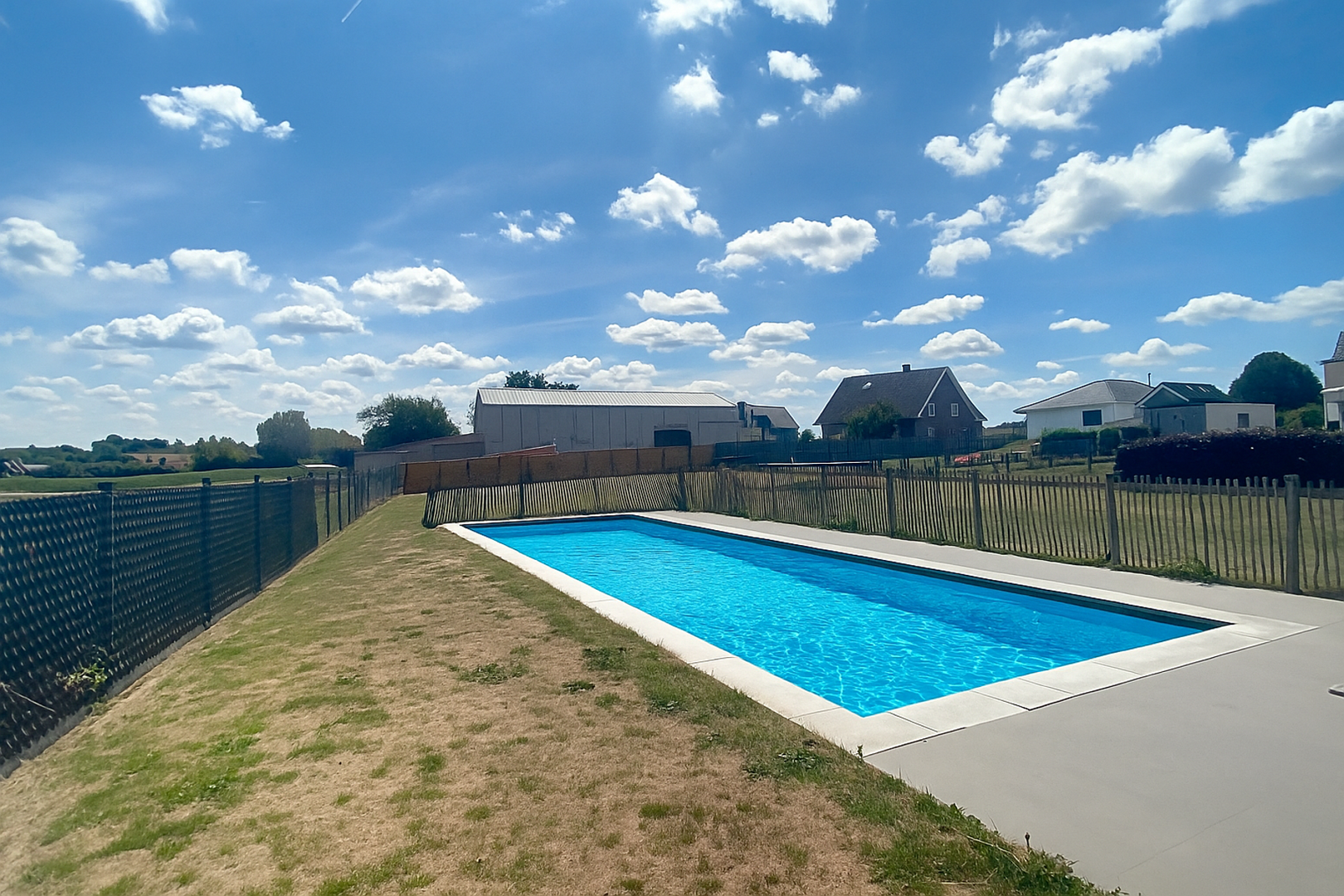 De volledig aangelegde tuin is zuidgericht en voorzien van een prachtig zwembad met uitzicht op de omliggende velden – ideaal voor wie houdt van rust en ruimte.